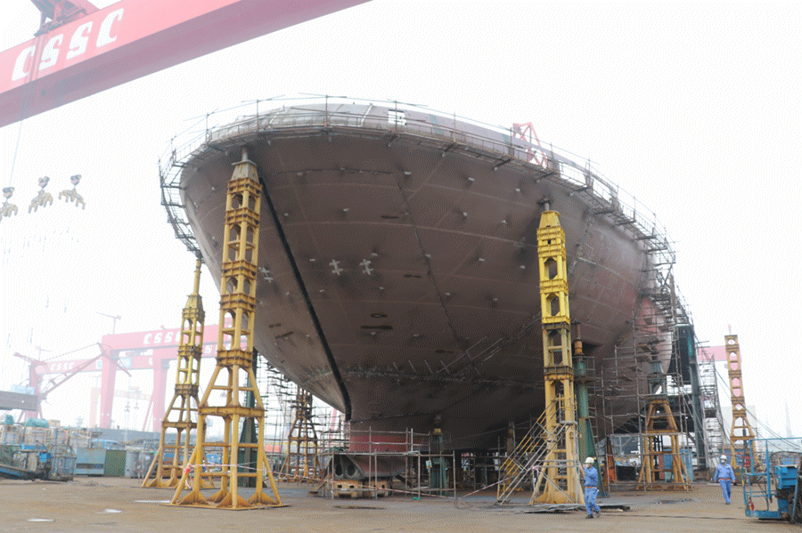 廣船國際總裝部集中精銳力量,與船東、船檢密切配合,克服了疫情影響,實現(xiàn)了艏部總段的快速成型,為艏門開啟提供了條件。