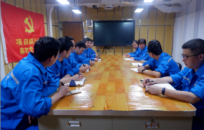 毛獻(xiàn)群在艦上同項(xiàng)目組成員一起討論技術(shù)問題