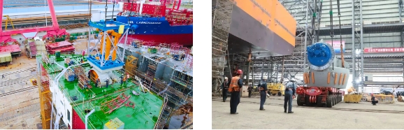 “夢想”號配備的7臺推進器中,3臺全回轉伸縮推是黃埔文沖迄今總成過的最大伸縮推,并且建造過程中伸縮推需要進行全程升降試驗,升降高度差達4.3米。完成試驗的伸縮推總段重量超過了船廠龍門吊最高900噸的起重能力。“夢想”號工藝負責人馮仕清創新性地提出了采用龍門吊和履帶吊聯合吊裝的方法,最終保證了伸縮推的成功安裝。